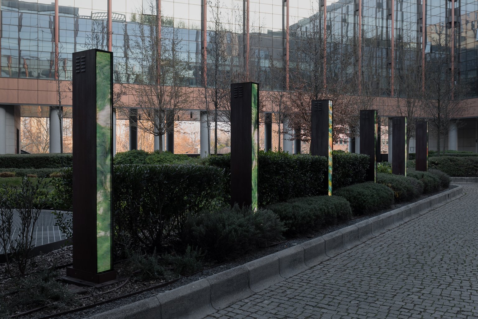 Artificial Botany .phase is a tailored adaptation of Artificial Botany .morphos designed specifically for the 41 LED columns distributed throughout the Media Garden at CUBO Unipol in Bologna (IT). The piece was first exhibited during the studio's solo show at CUBO Unipol in 2022. It was later featured during the Artificial Botany exhibition at the San Francisco Italian Cultural Center in 2023, where two pieces acquired by Unipol were shipped and displayed.