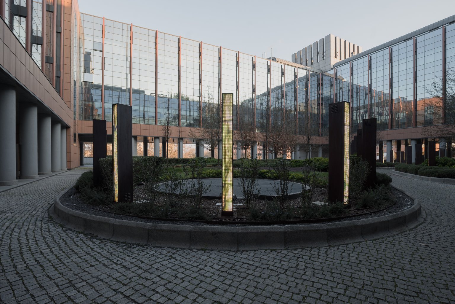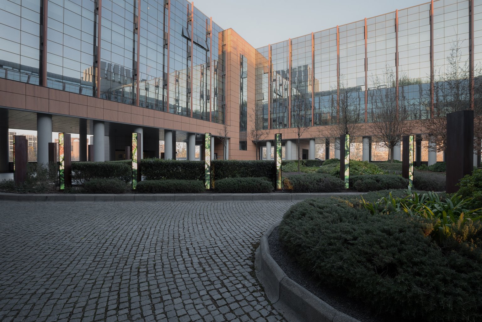 In the section of the Media Garden where the columns are arranged in a circle, the 360° audio system enhances the piece, providing a more immersive and encompassing experience.