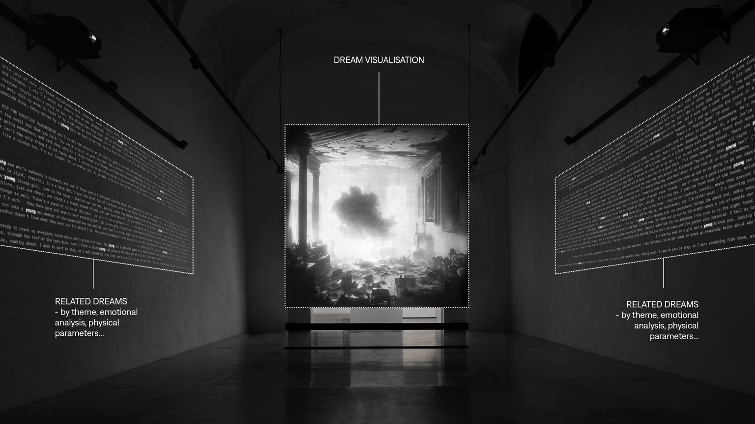 The result is a stream of consciousness where dreams flow one into the other as a series of short films, tracing the actual cadence of NREM and REM dreams present over the course of a night's sleep. The sequences are artificially generated by a machine learning system that translates the text of dreams into a series of subsequent hallucinations that bring to life the characters, objects and landscapes described.