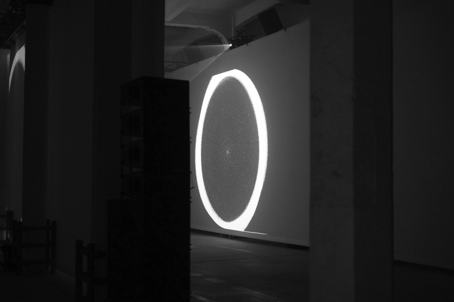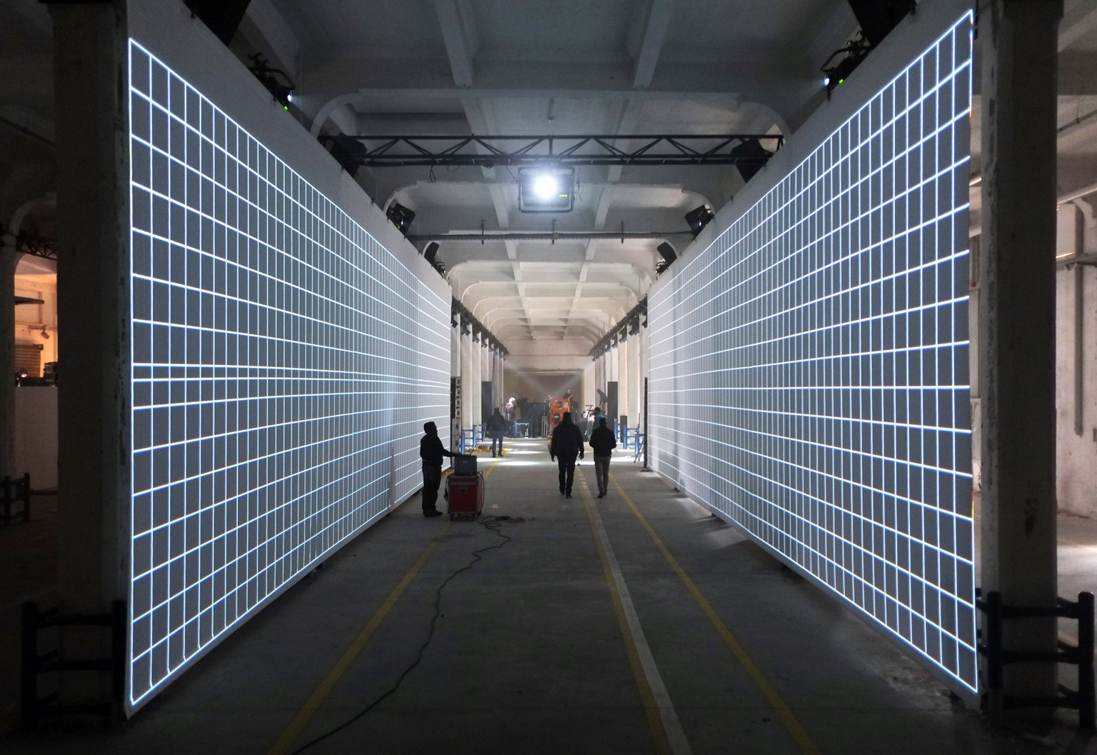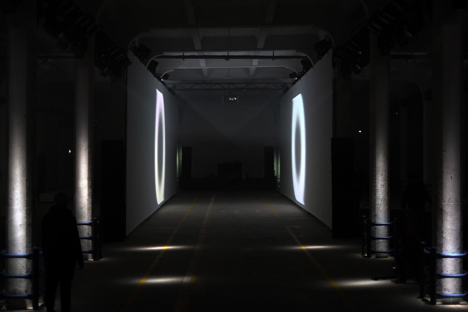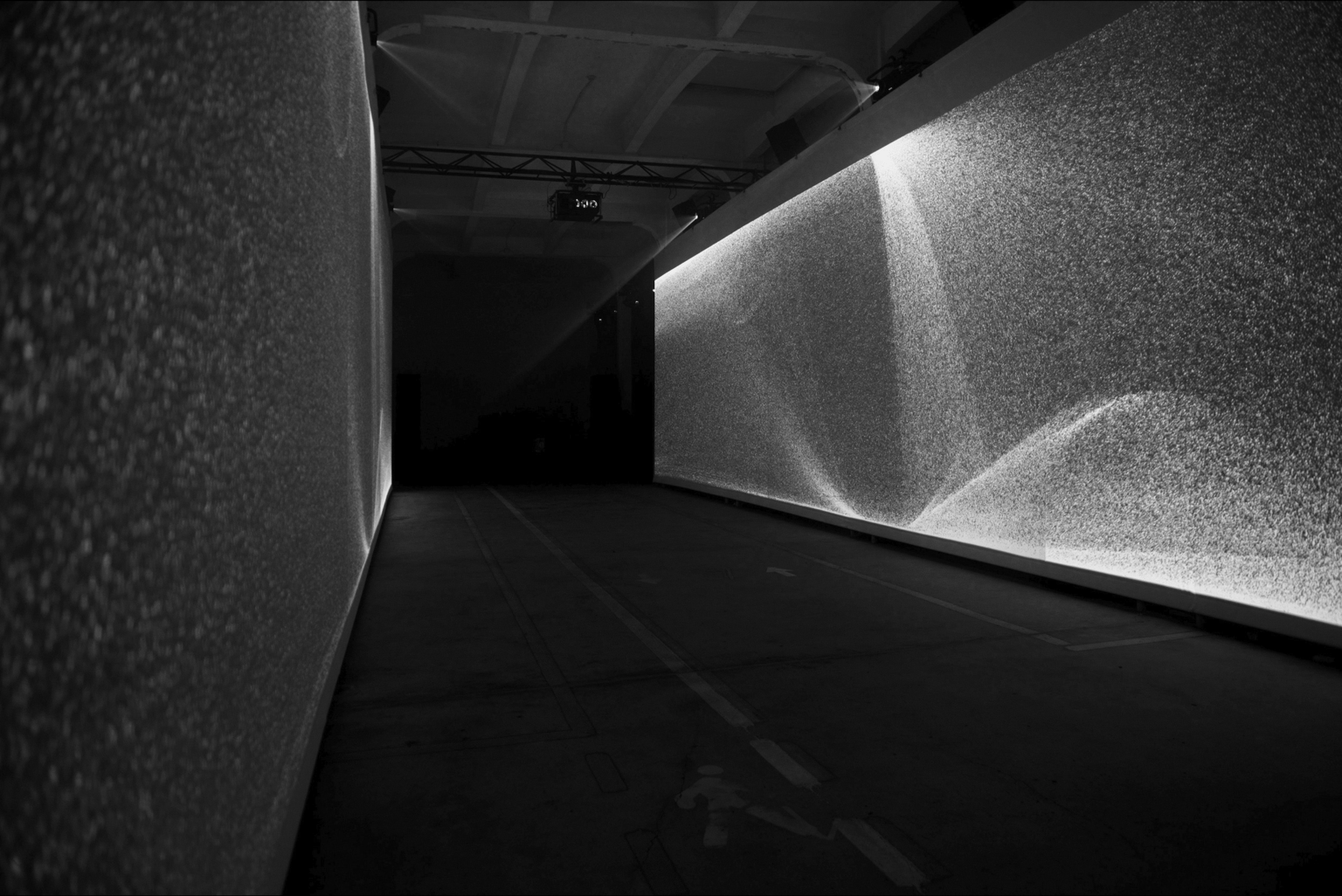 The Clepsydra display foresees two video projections, twenty metres long and five metres high. The immersive quality of the two large screens, one in front of the other, may be experienced by the visitor either through the corridor formed by the two screens or by choosing to view the installation from the outside. The installation was designed to be integrated within the Ex Scalo Farini in Milan, featuring a matrix of columns that characterise the architecture of the space.