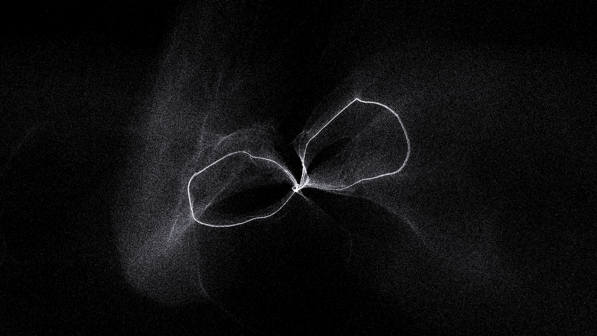 Featuring a large number of particles scattered in the scene, the shape is housed on an interactive canvas the user can directly modify through a change in the point of view. At the same time, the interface at the bottom of the scene allows for a controlled reorganisation of the particles based on a study of chaotic dynamical systems and forces balance.