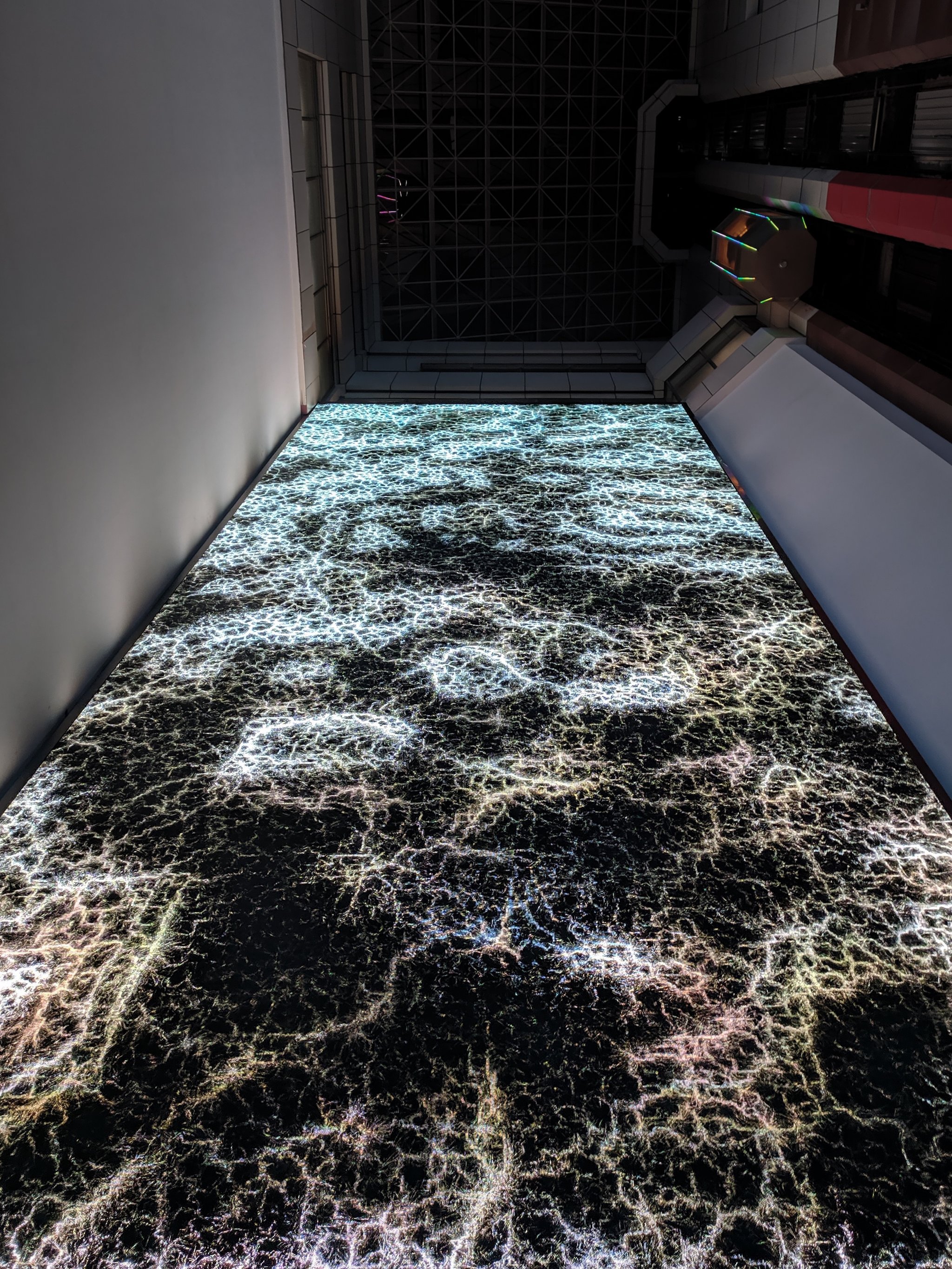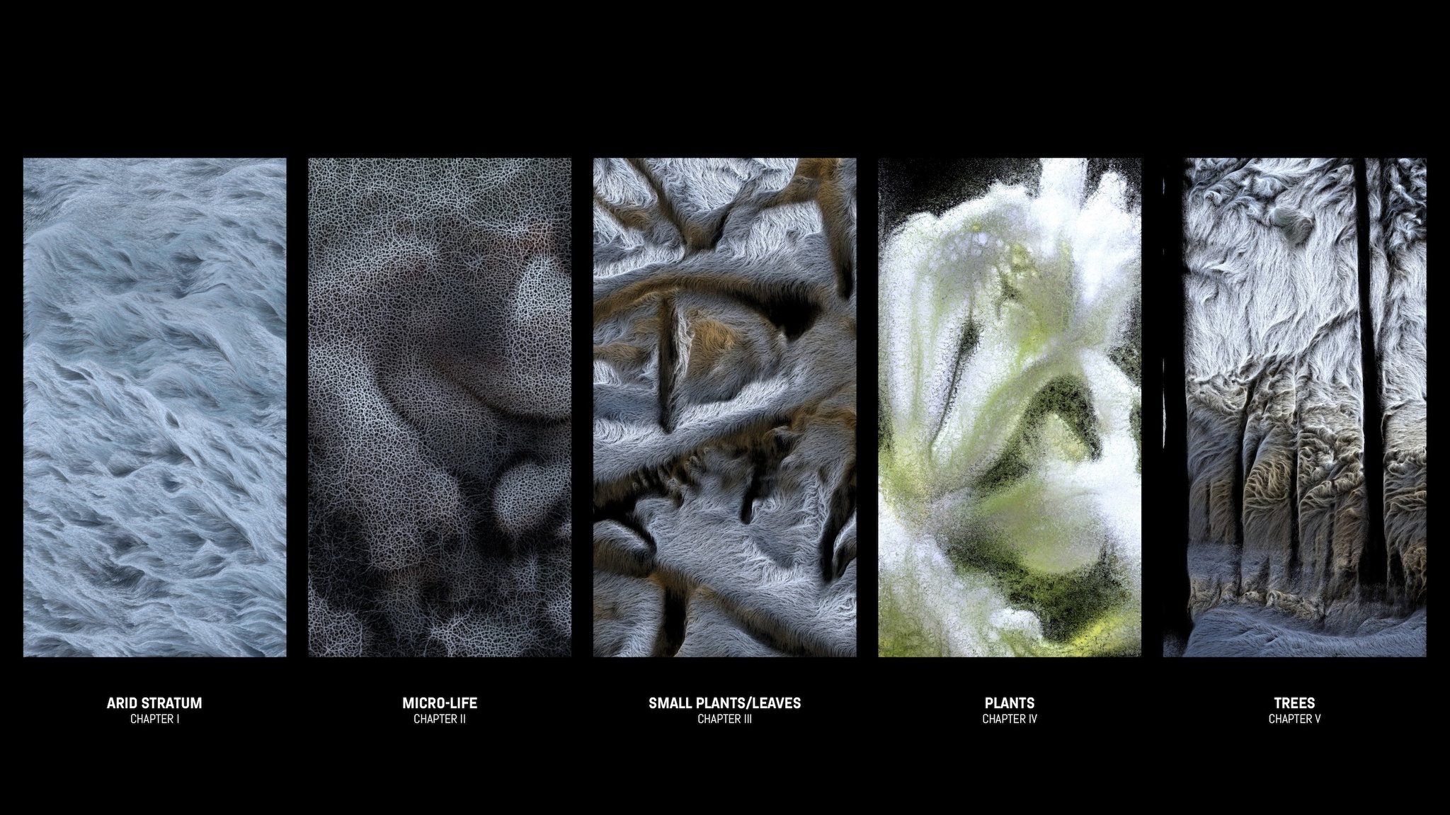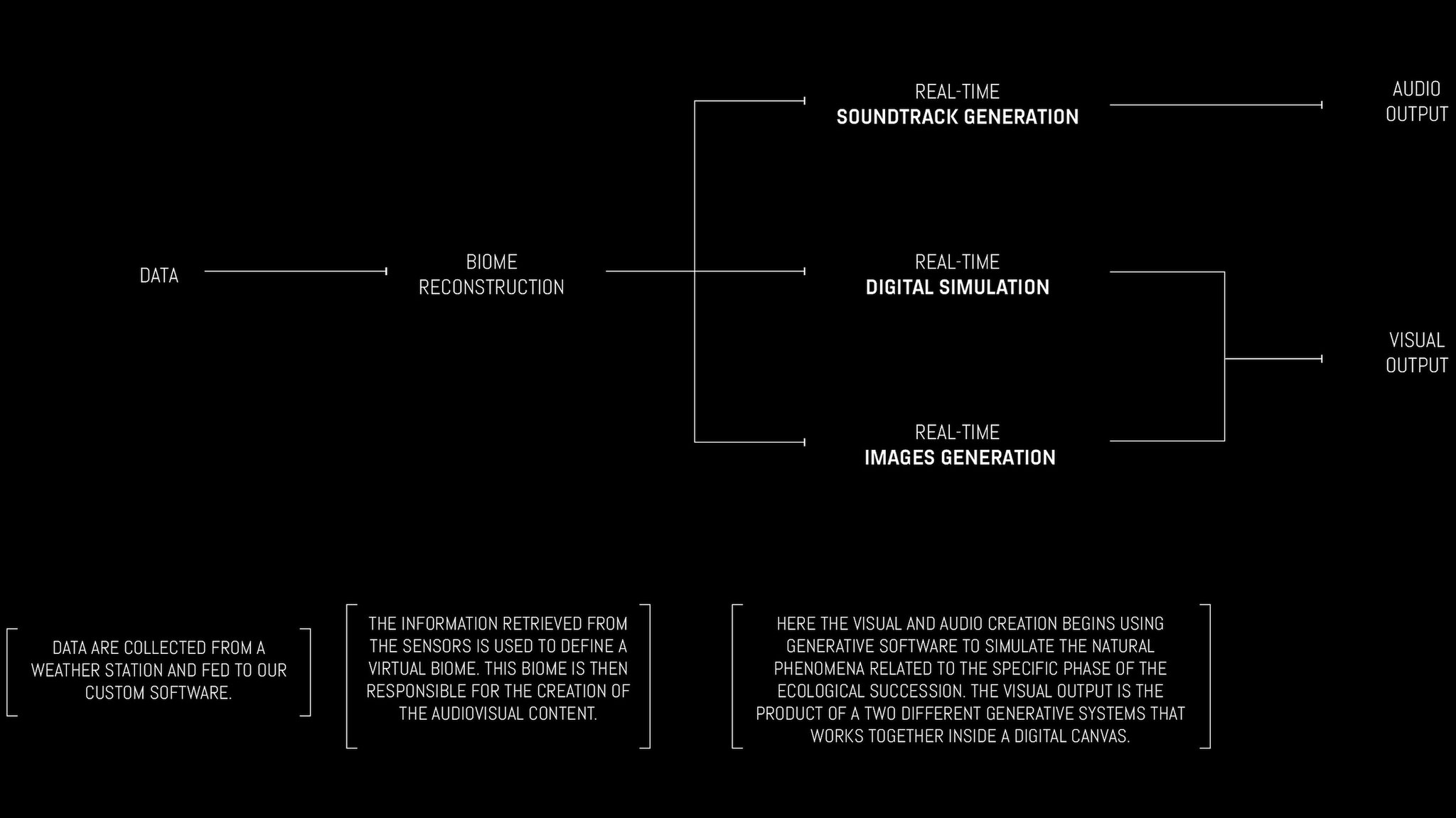 Mimesis is a large-scale installation which takes inspiration from the biological evolution of life on the planet while investigating the influence that anthropic action has on earth. It wants to explore our positive vision towards what can be preserved, changed or improved in our ecosystem and the consequences of our practices on different habitats. Since the beginning of our history, we as humans have tried to imitate and reproduce aspects of reality in order to create a meaningful representation of everything that surrounds us. How can we represent the scenario that is ahead of us, our future planet? Through this work, we try to reveal how the future will be influenced by the way we interact with the environment. In order to do this, we created a generative system which collects and elaborates data from the local environment where the installation is staged. These data constantly affect the visual and sonic outcome, creating an audio-visual generalization of the future environment that we’ll inhabit.
