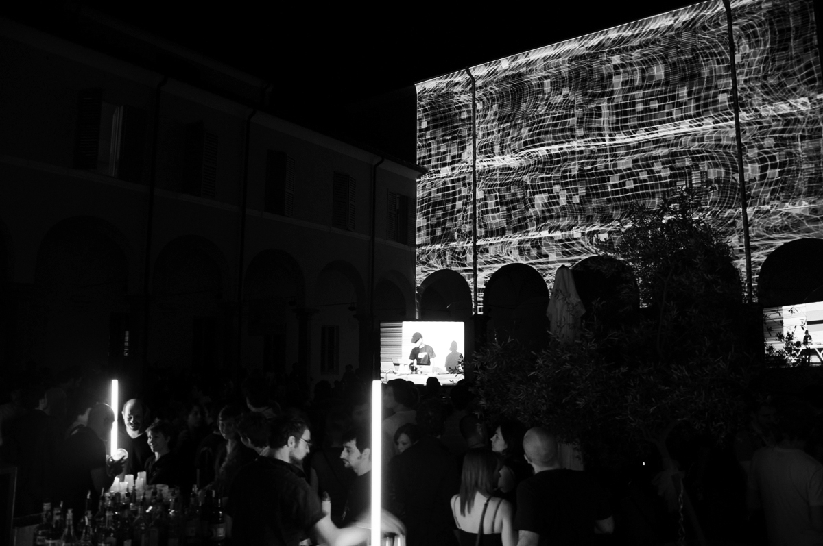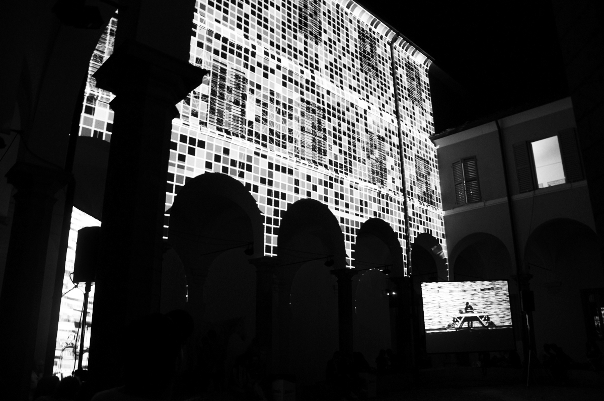 The first version of N has been commissioned by NODE Festival in Modena, one of the first occasions where we came in contact with the festival. The mapping was located on the facade of the inner courtyard of Palazzo Santa Margherita and coincided with a performance by a still little-known Ryoji Ikeda. N was set to react in real-time to the music of Ikeda’s show, creating distortions and ruptures in the visualised grid shape. Subsequent performances featured live music by our sound designer, Riccardo Bazzoni.