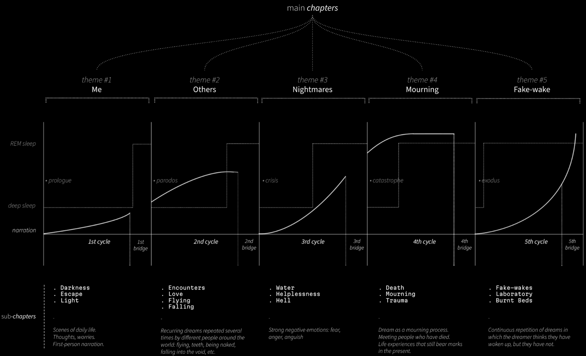 The narrative structure is composed of fragments of real dreams sourced from the dream banks of the University of Santa Cruz California and the University of Bologna, which in total contain over 28,000 dreams collected from 1930 to the present day.