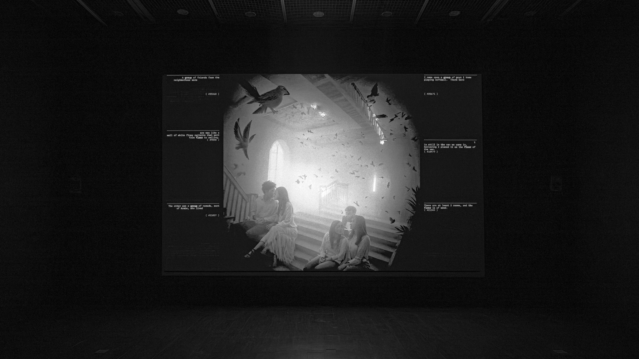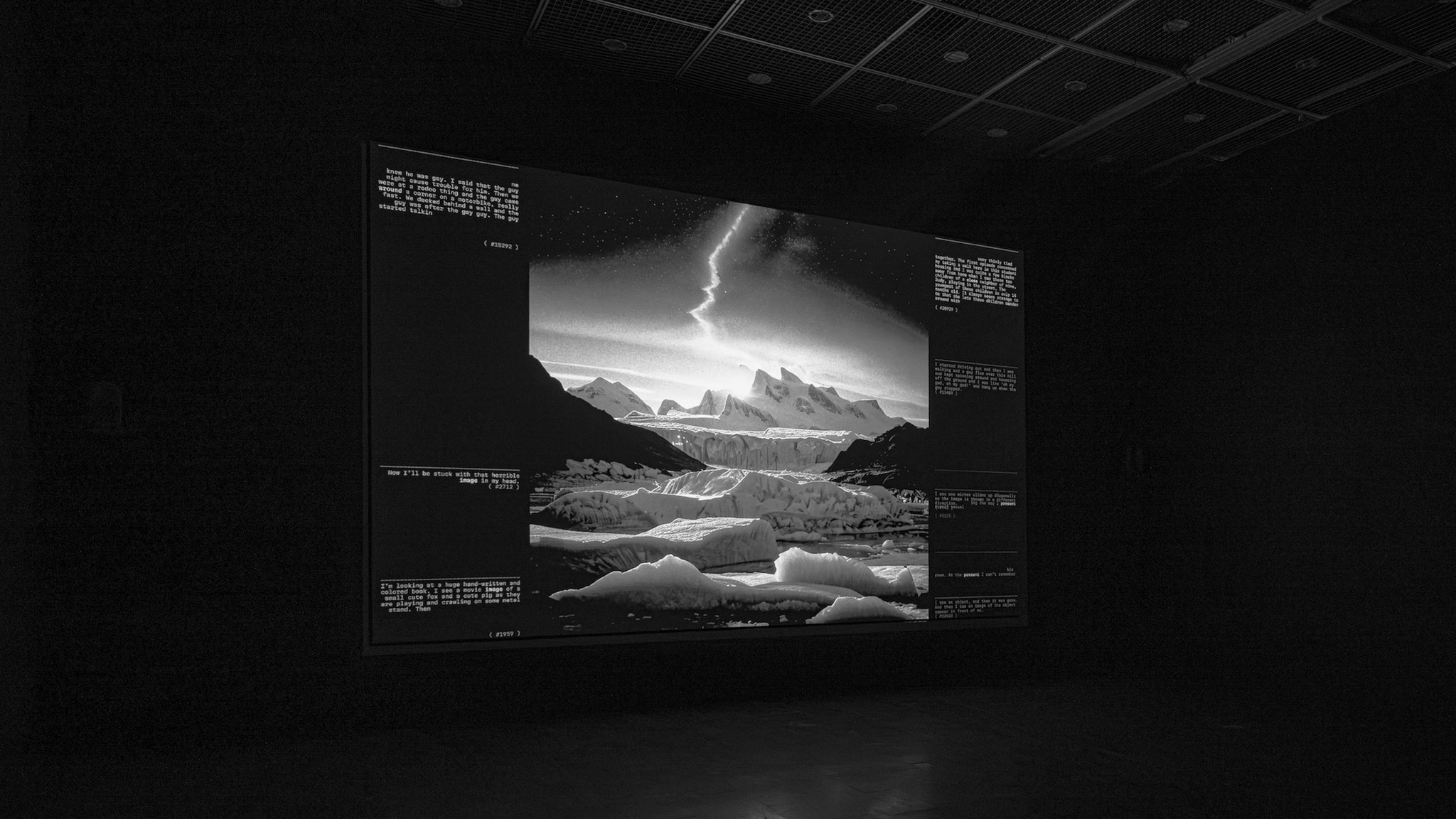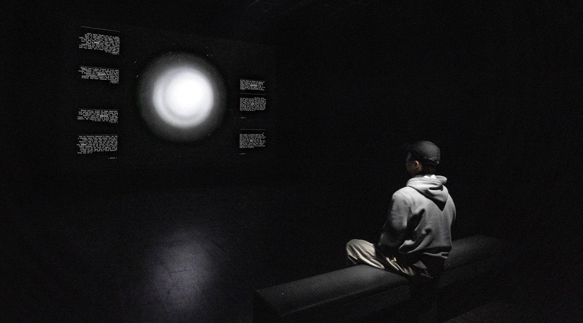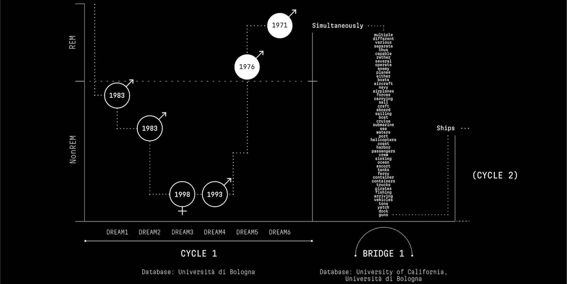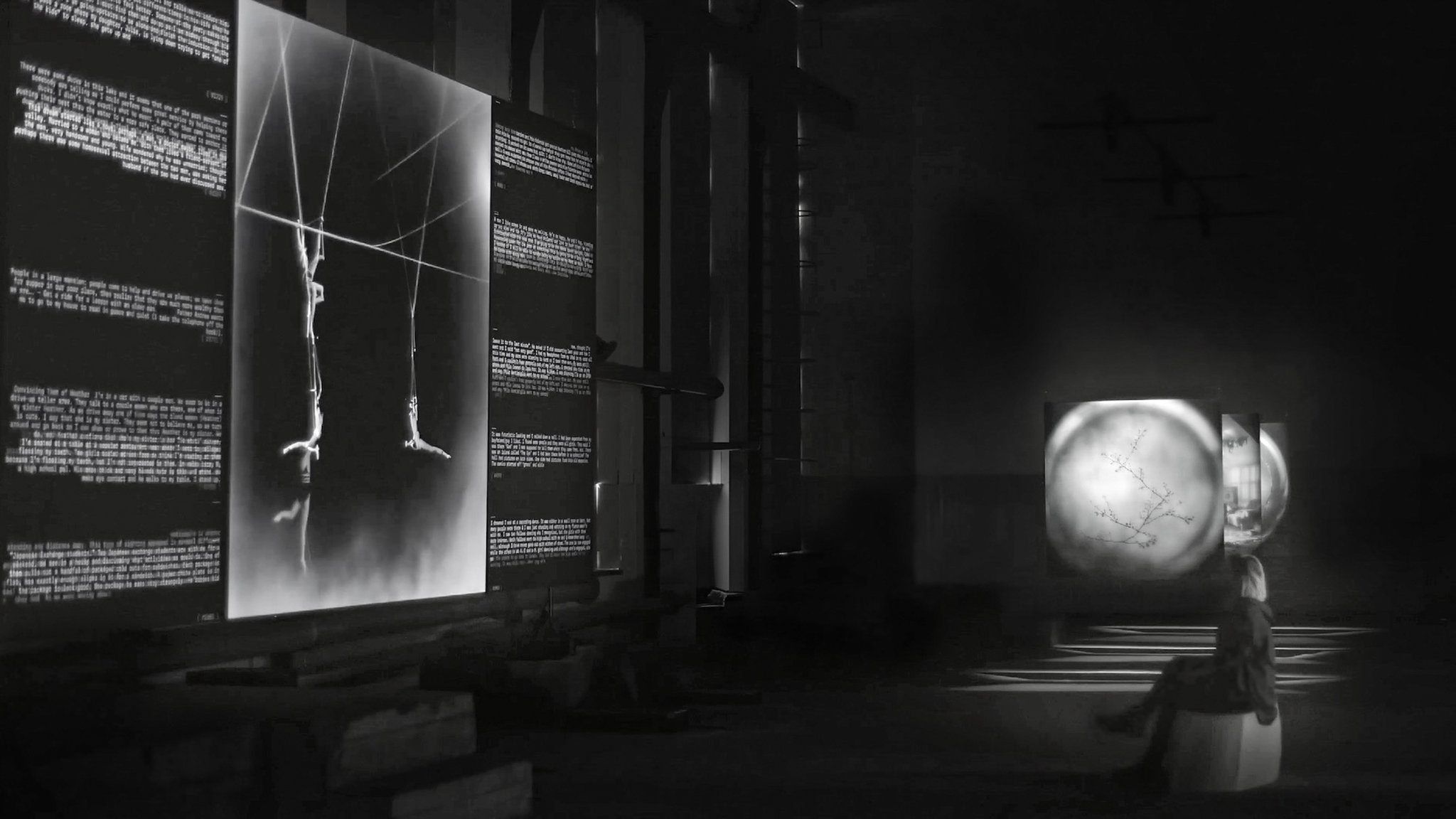 The most significant change from the original installation is the reconfiguration of the side wall texts: these elements have the goal of expanding the visitor’s perception of the archive, creating thematic and semantic connections between different dreams. As specific keywords are spoken, texts from other archived dreams that are syntactically linked to these words appear along the sides of the square canvas. These correlations are further explored during the bridge phase, or interlude sections, where they are shown at a very paced rhythm, creating an emotional climax.