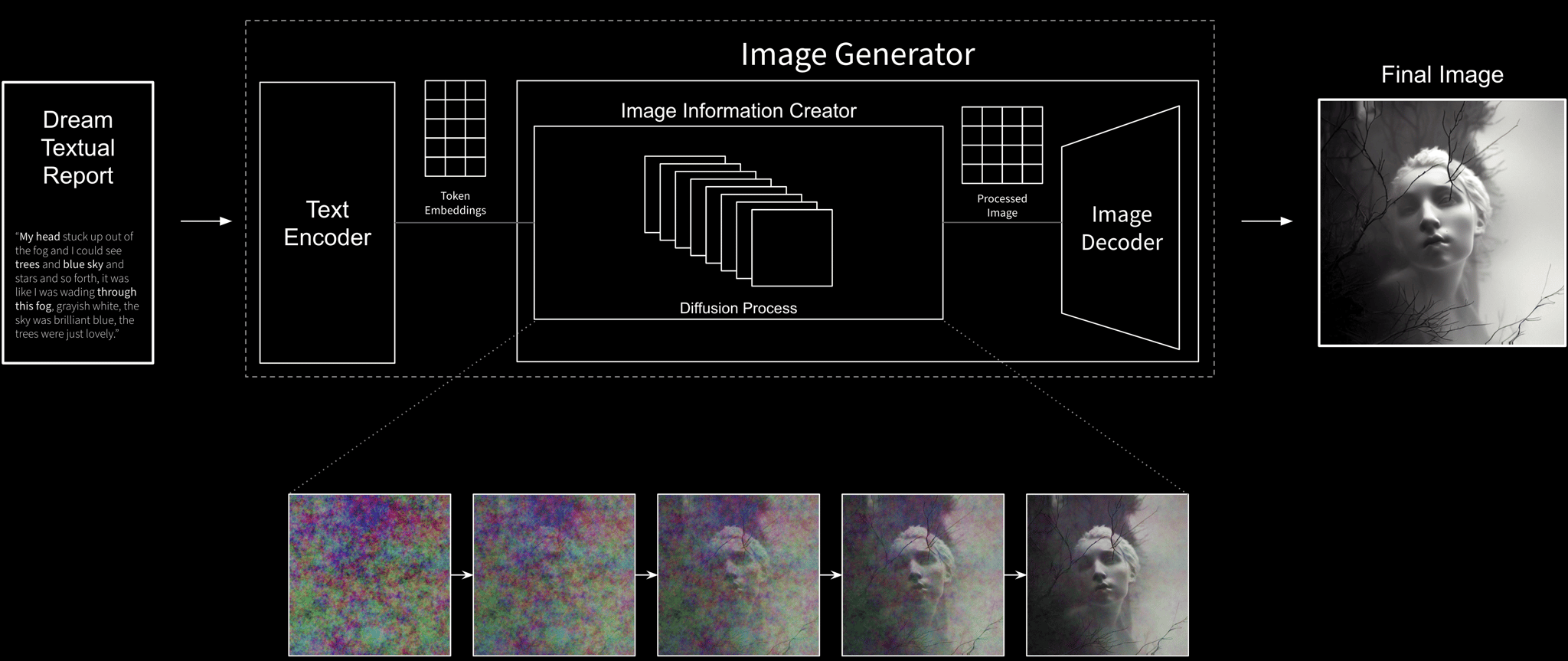 The result is a stream of consciousness where dreams flow one into the other as a series of short films, tracing the actual cadence of NREM and REM dreams present throughout a night's sleep. The sequences are artificially generated by a machine learning system that translates the text of dreams into a series of subsequent hallucinations that bring to life the characters, objects and landscapes described.