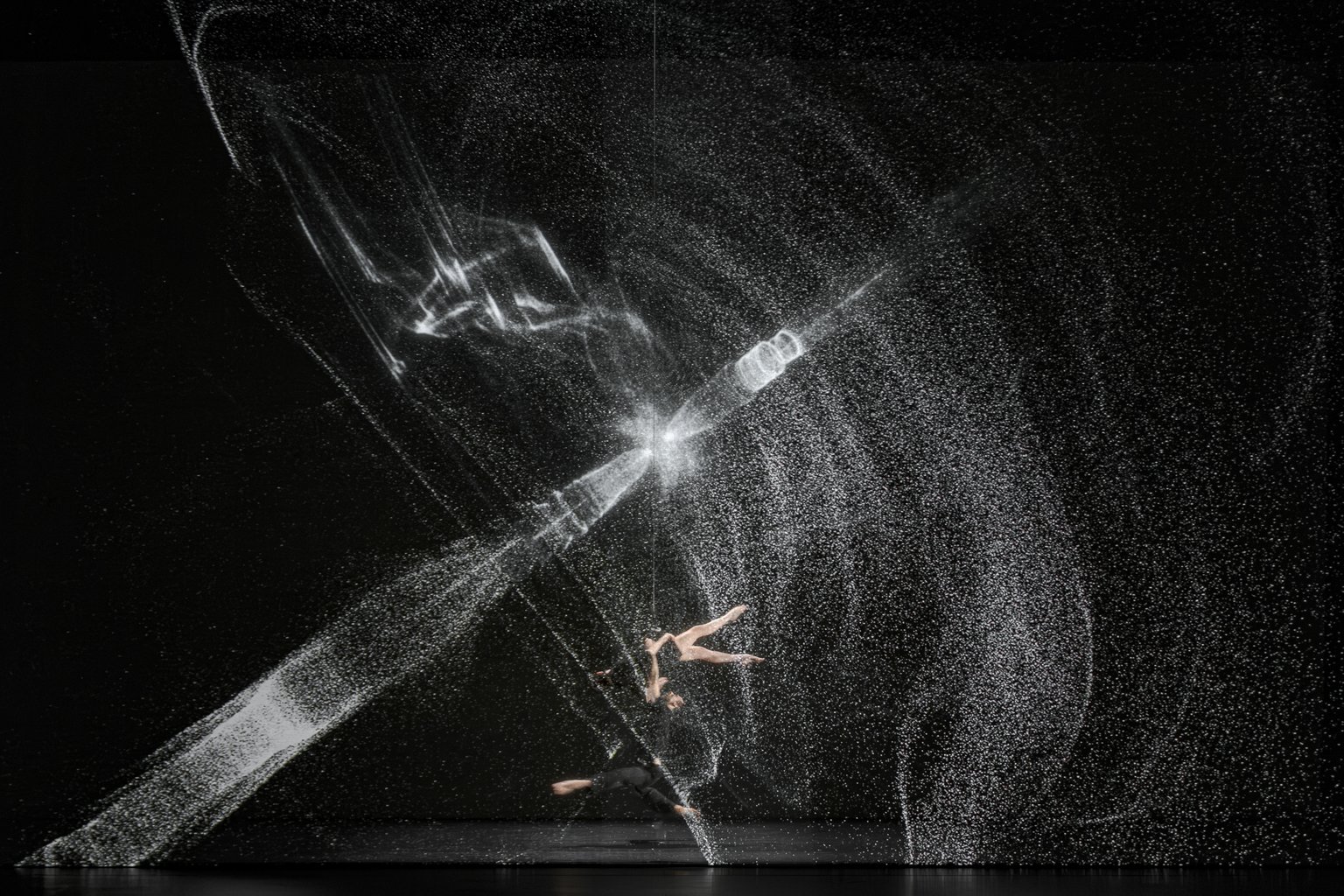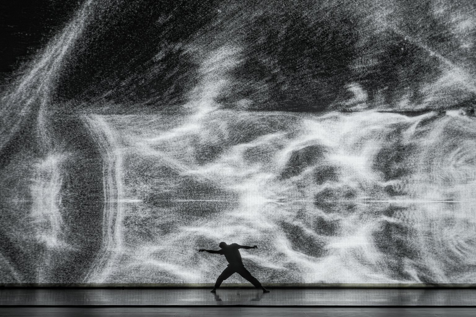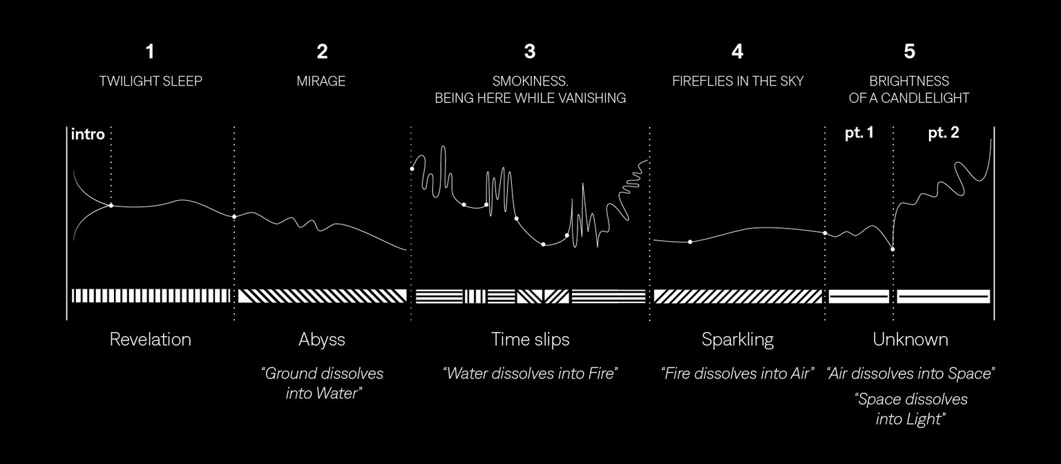 As the final chapter of a trilogy, Sál builds upon the narrative threads established in the two previous live performances, Ljós (2014) and Dökk (2017). Ljós (“light”) explores the theme of birth, “coming into the light”, while Dökk (“darkness”) delves into the concept of interdependence, revealing how each element is inevitably connected to the others in a dynamic balance. In Sál, the focus shifts to the horizon, to the boundary of human life, embracing the notion that everything is in a state of constant transformation, that everything is impermanent.
