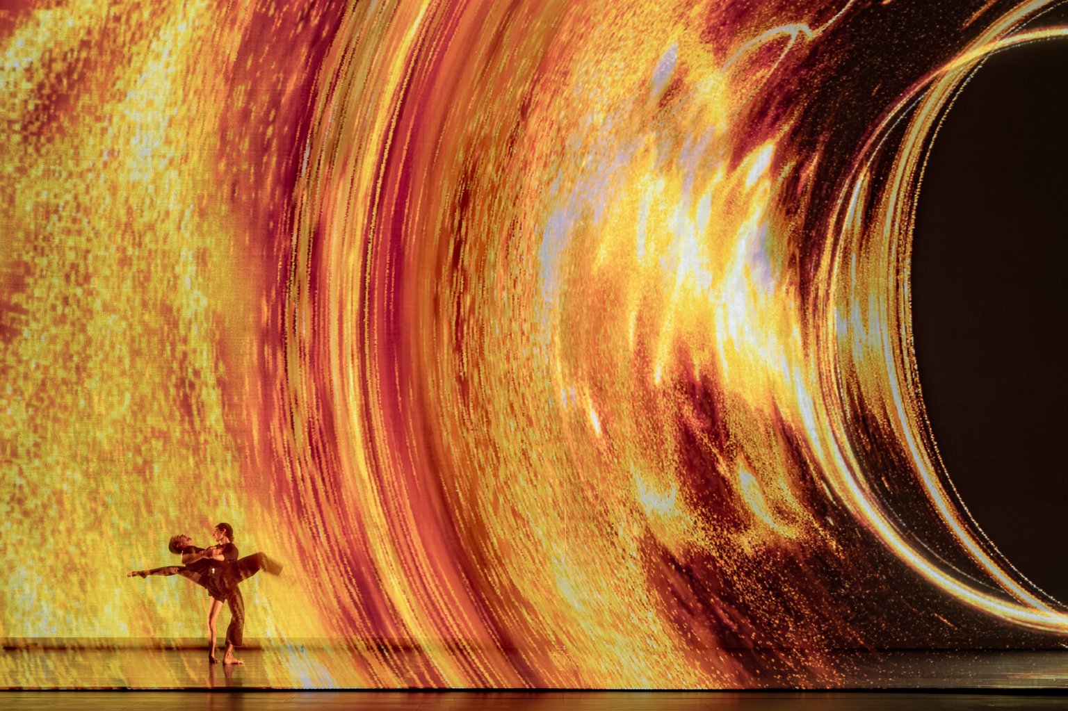 Impermanence compels us to face the unknown and the sense of mystery: the fear and wonder we experience when encountering something beyond our full comprehension. To represent this, the visual narrative of Sál focuses on observing what happens to light and matter in the vicinity of black holes through a series of simulations developed in collaboration with the University of KU Leuven and Toronto University.