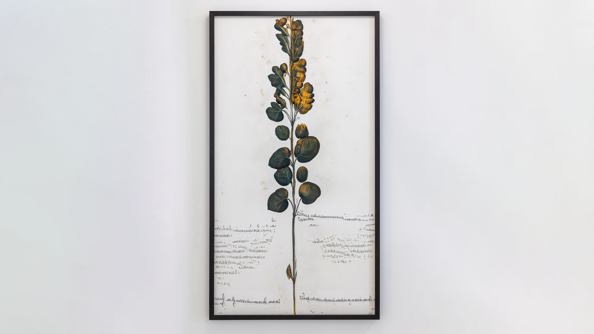 The aesthetic of the work significantly diverges from previous Artificial Botany prints, featuring a predominantly light, paper-coloured background from the Aldrovandi dataset. Another important element is the text in the bottom section of the print, which the machine learning algorithm attempted to replicate. Representing as a central subject an organic shape extending vertically throughout the length of the print, the work is another attempt at eerily capturing and imprinting on paper the synthetic mutability born from the machine learning representation of the ever-changing natural world.