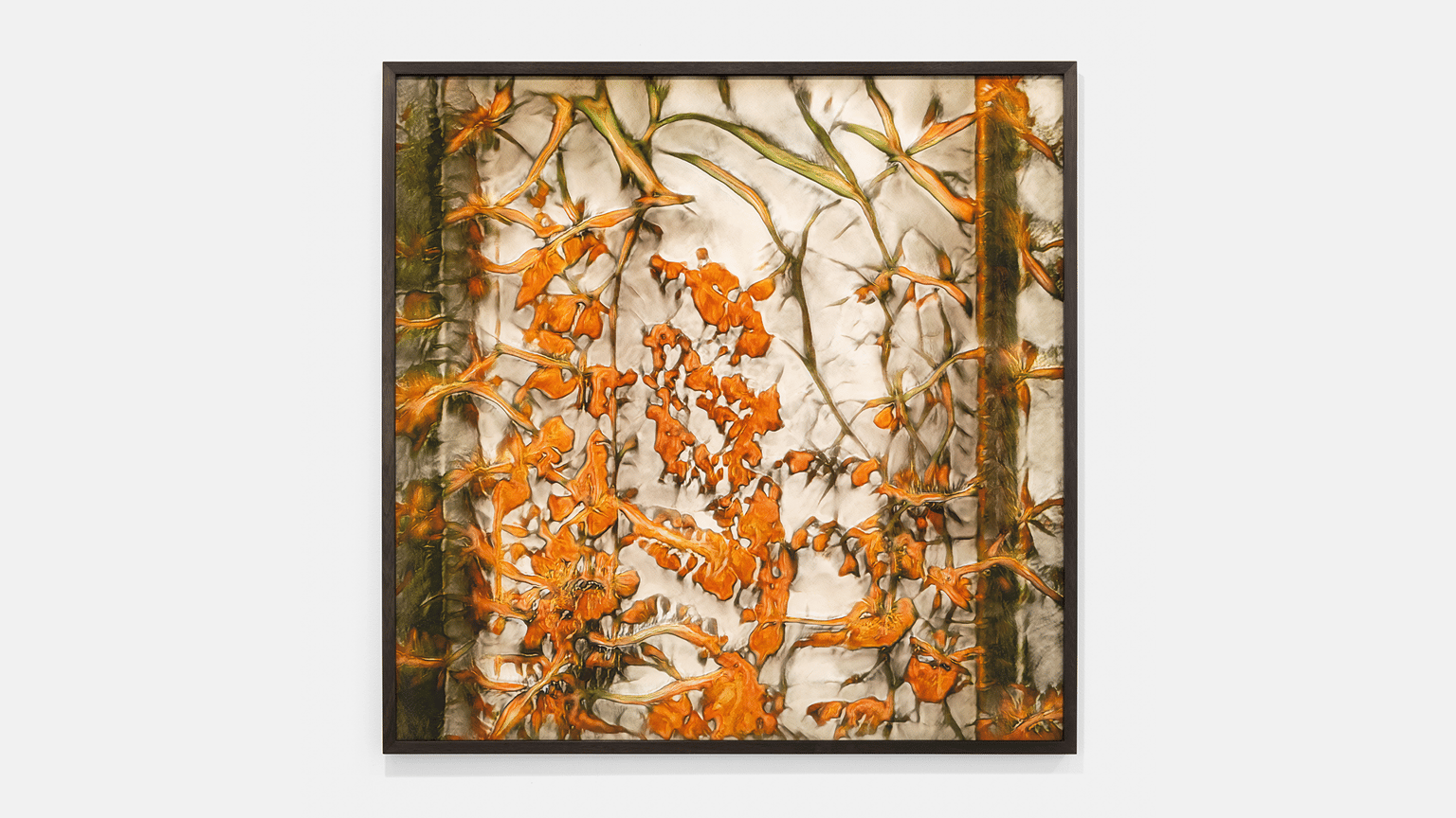 Captured as an imperceptible moment in its infinite flow, the print embeds the artificial landscape on paper. The synthetic shapes are outlined in their vibrant red colour, as the result of one of the initial trainings carried out on photographs of forests and leaves.