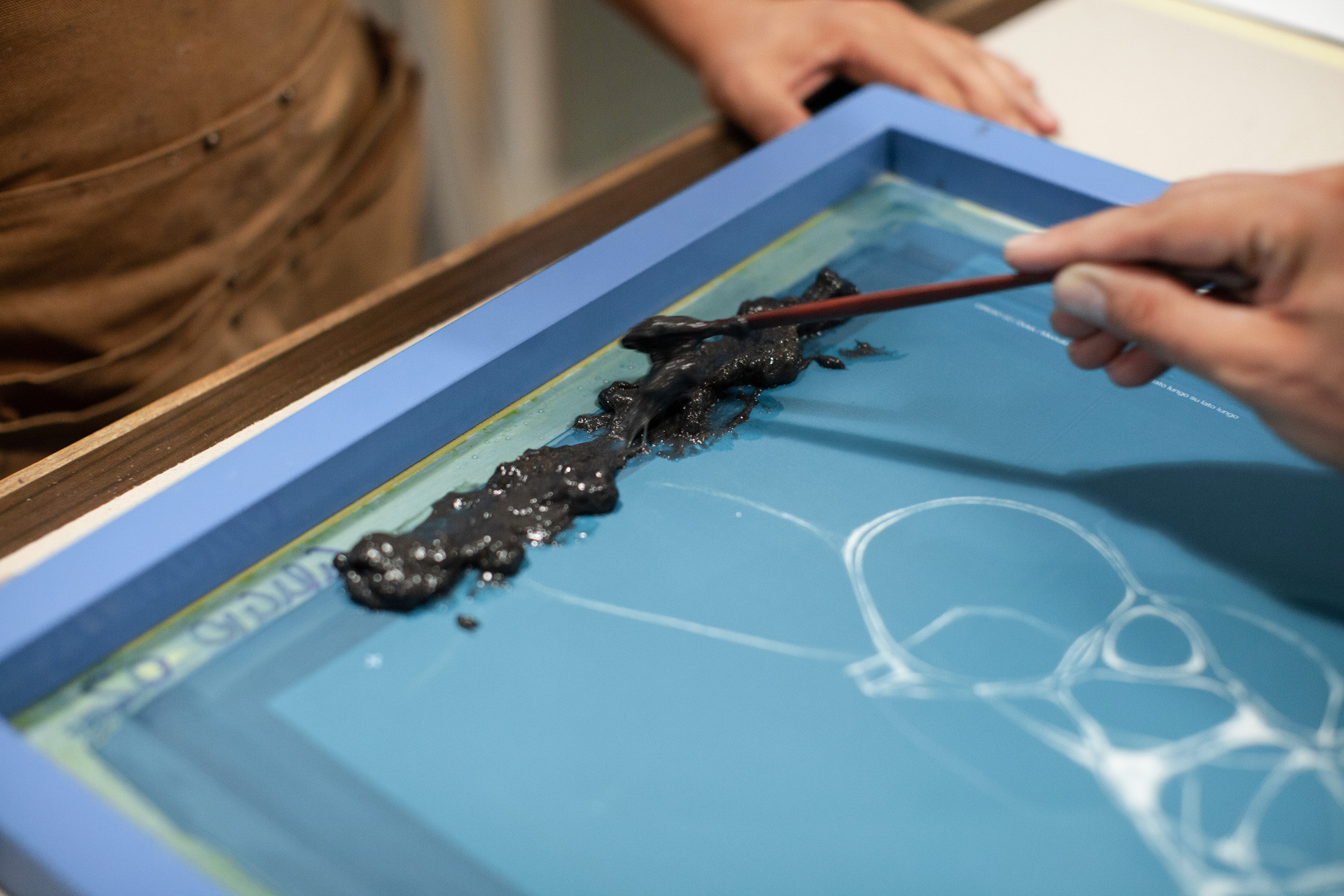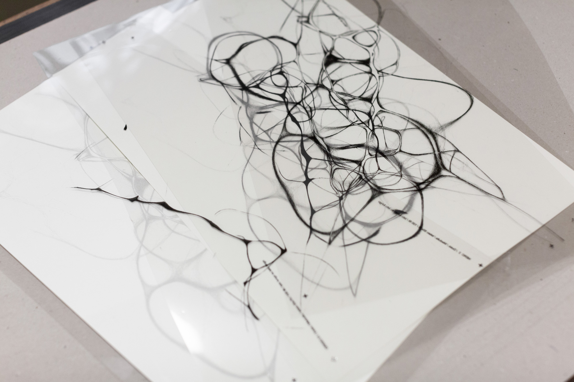 The prints were created together with a local print studio named Medulla, old collaborators and friends of fuse*. Medulla often works with organic materials and pigments: for this particular print, they created a palette of greys of various intensities, blending together two different types of graphite. The application of colour was split into four main levels, and a different tone of grey was used for each of them. The high resolution of particles was achieved thanks to a canvas of 100 threads per linear centimetre, each with a diameter of 40 microns.