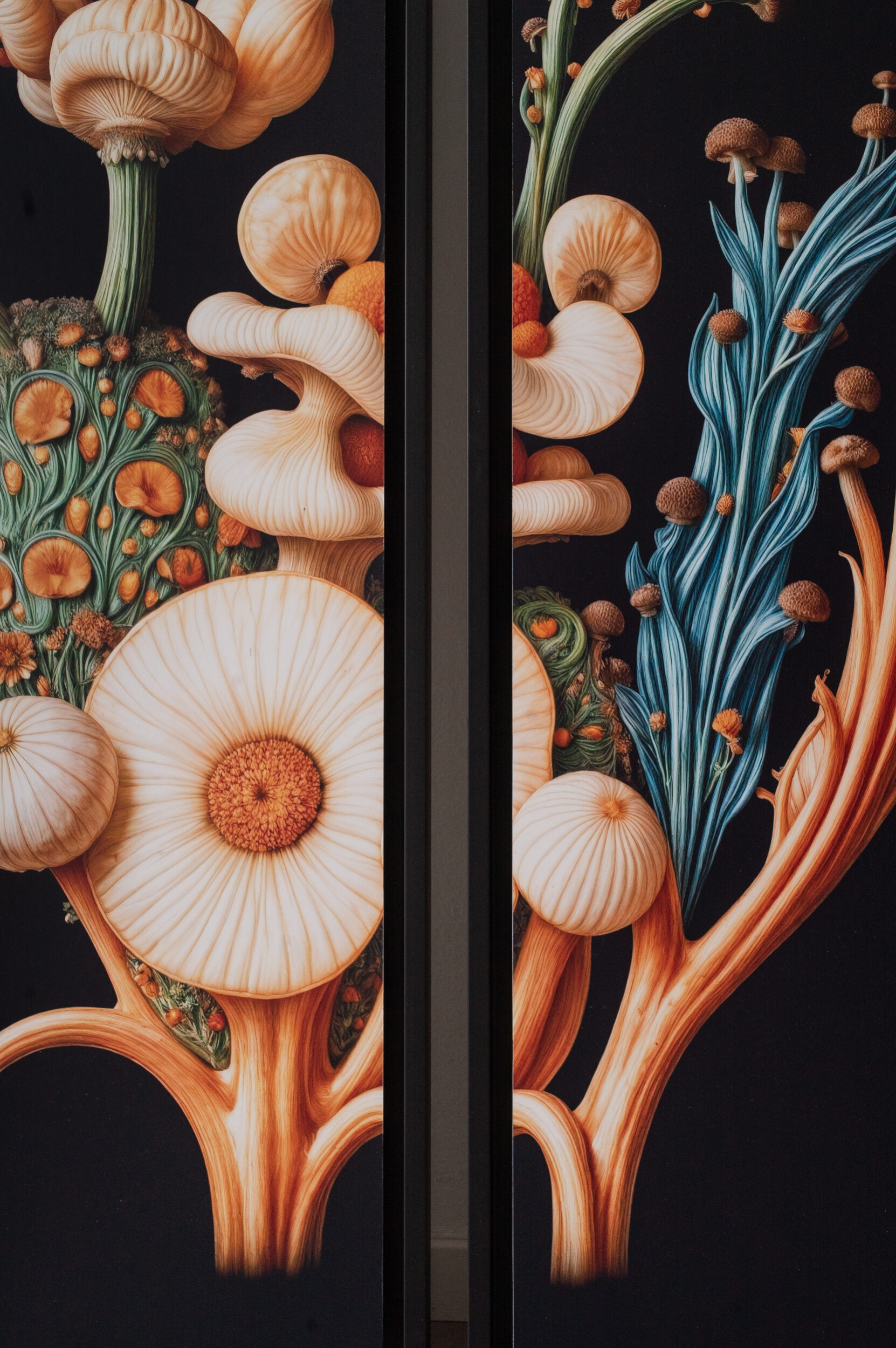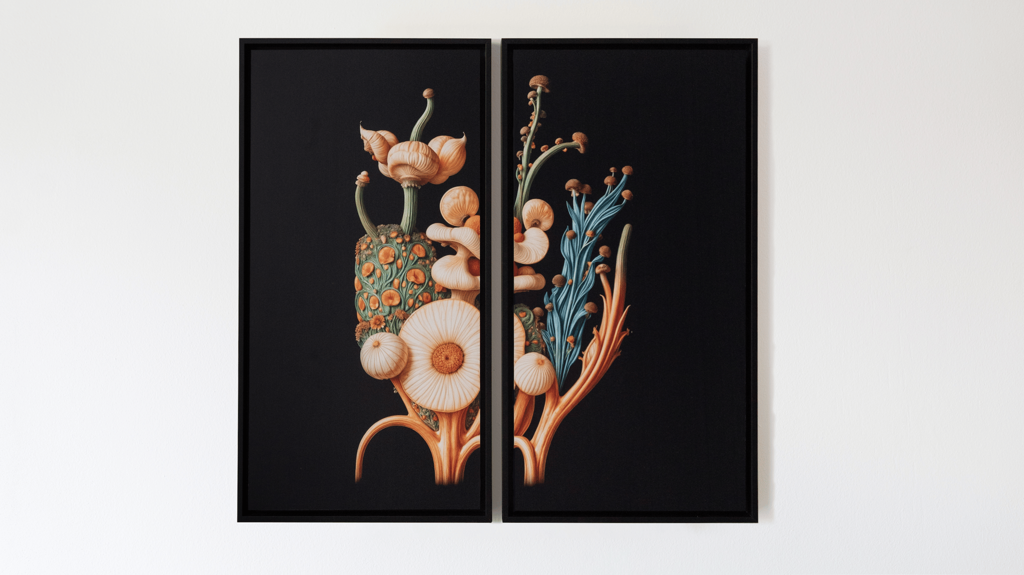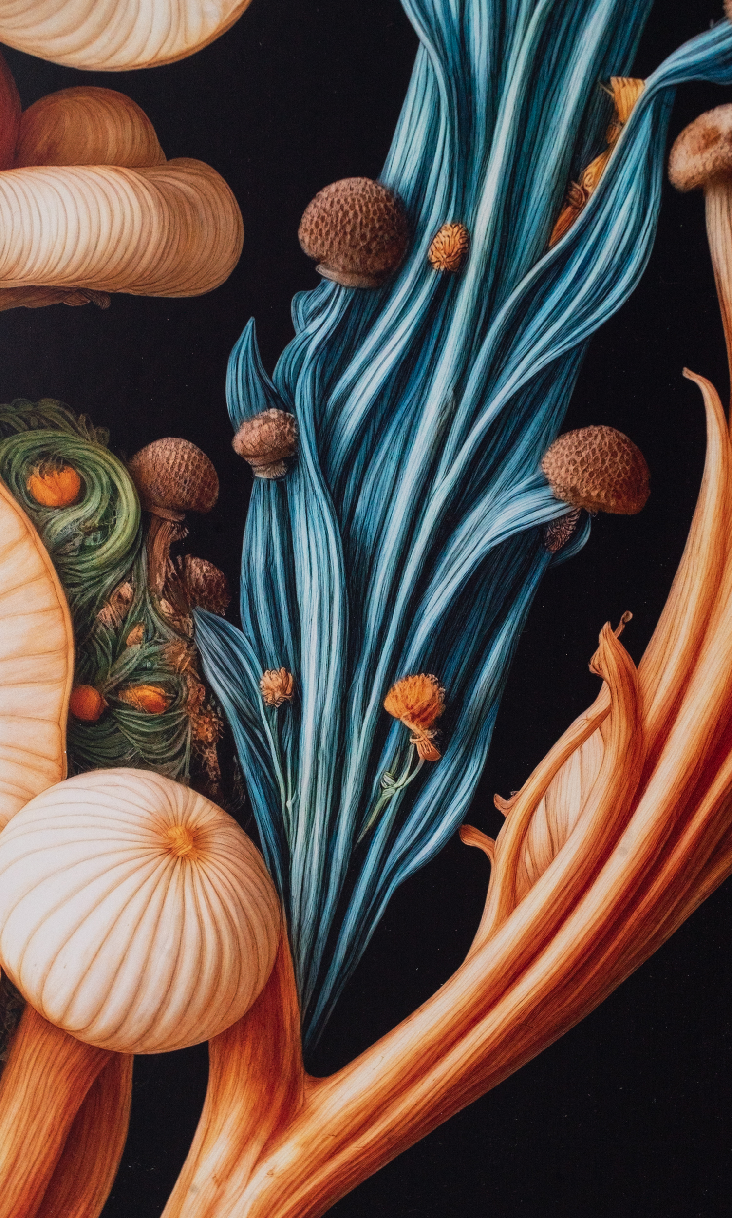 Expanding our research for physical mediums, for this series we created Unseen Flora .BH03: a print distilling a single moment from the video series into a tangible, physical form. Visually, the work builds on a narration dedicated to Beatrice Hastings, one of the four botanical illustrators and explorers whose stories are told through the series. Mainly focused on the study of fungi, Hastings' journey, her divorce to pursue botany independently, and her discovery of the extinct bioluminescent fungi species stand as a testament to her resilience.