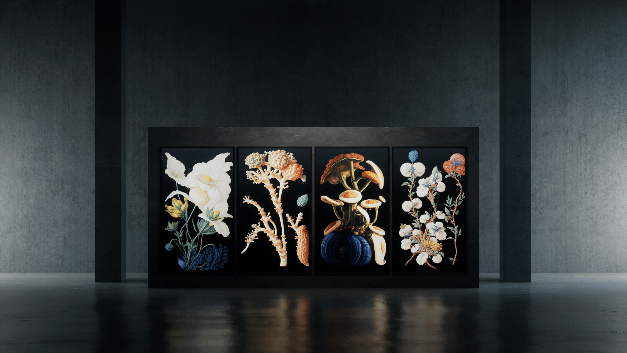 Unseen Flora .morphos IV is a shape-shifting audiovisual installation and the latest addition to the series of Unseen Flora. This piece reimagines the synthetic botanical illustrations created by the four fictional botanists—Charlotte Bancroft, Beatrice Hastings, Edmund Thorne, and Theodore Winslow—through a continuous flow of transformation and morphing. In its style and aesthetic, it reminds of the distinctive look and dynamism of Artificial Botany .morphos.