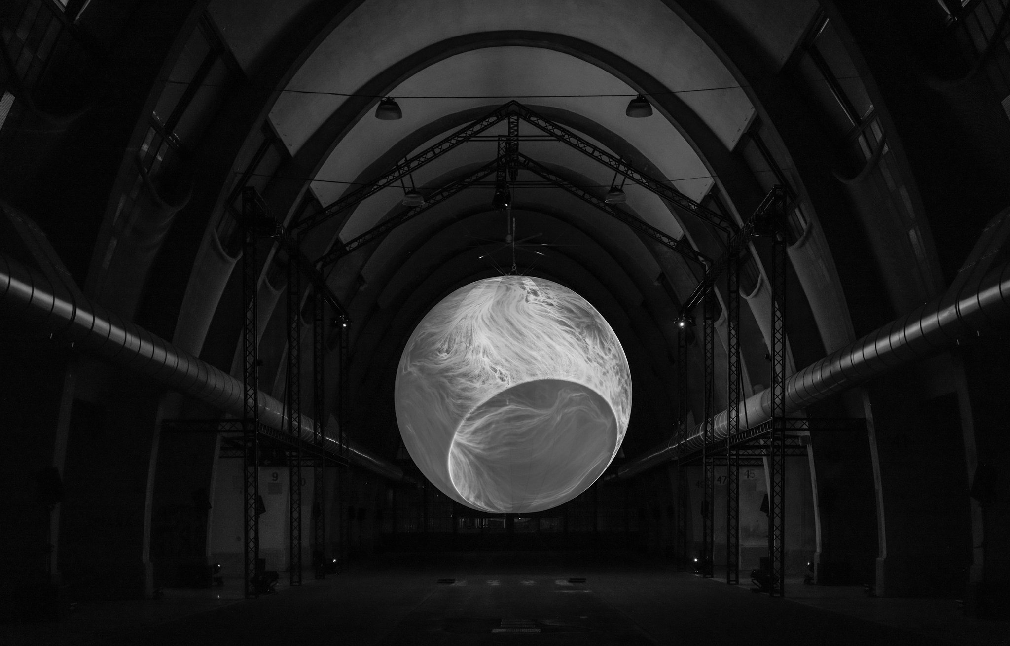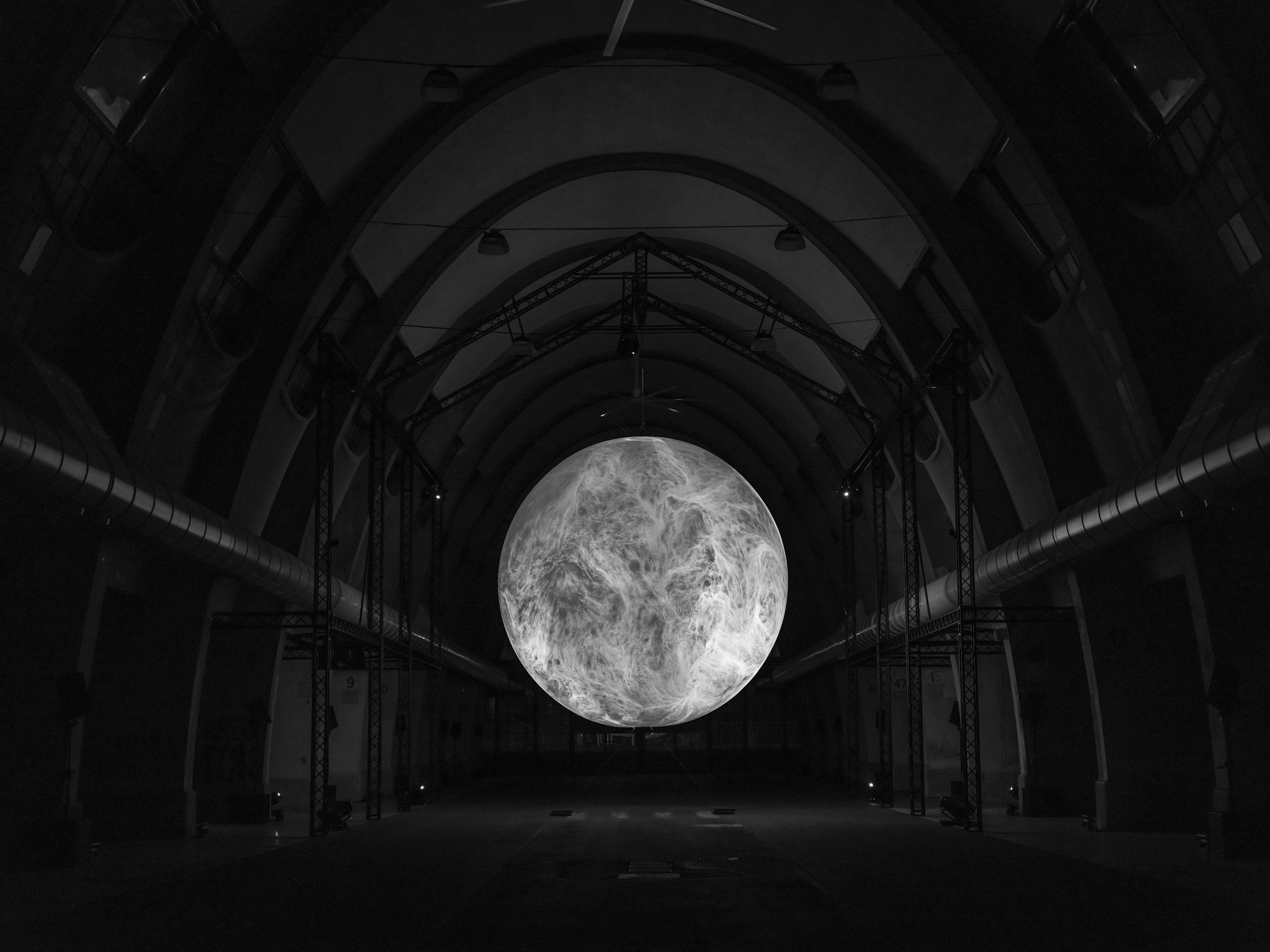The installation featured a 7.5m white sphere, floating in the space thanks to cables hung to a black truss structure. The skeleton sustaining the installation attempted to be as simple as possible so as not to be too prominent during the experience of the work itself. The installation was placed in the middle of the corridor, to allow visitors to fully experience the piece from all angles. An important adaptation involved the audio system: the original sound design had been optimised for a circular space, relying on a spatialization of the soundtrack through multiple audio sources placed around the perimeter of the building. The unique layout of Gallerie Mercatali required us to redesign the experience and devise methods to replicate the sensation of dynamic sound in its elongated space.