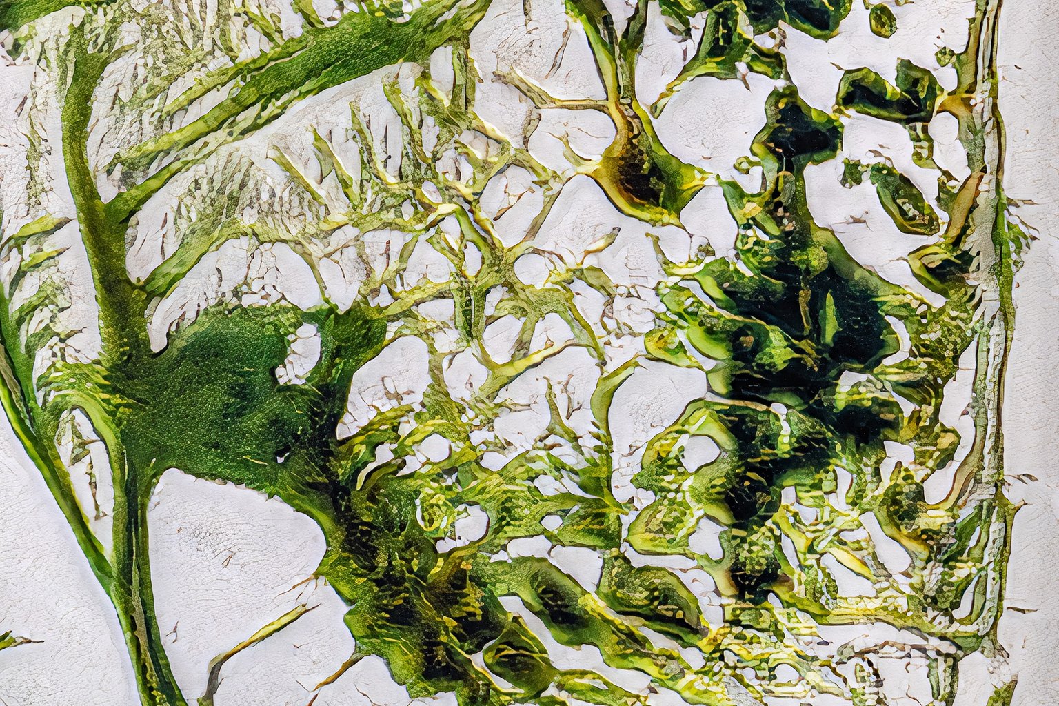 The project employs advanced processing techniques and transfer learning to envision potential future transformations in plant forms. In this exhibition, the physical merges with the digital thanks to pieces belonging to both worlds: on the side walls, a series of prints specifically produced for the show, depict botanical visions from the .morphos series. In particular, two belong to the merging and depiction of autumn leaves - easily identified thanks to the bright, warm colours. On the front wall, the digital component of the show is showcased: Artificial Botany flow. II, an additional component of the .morphos series.