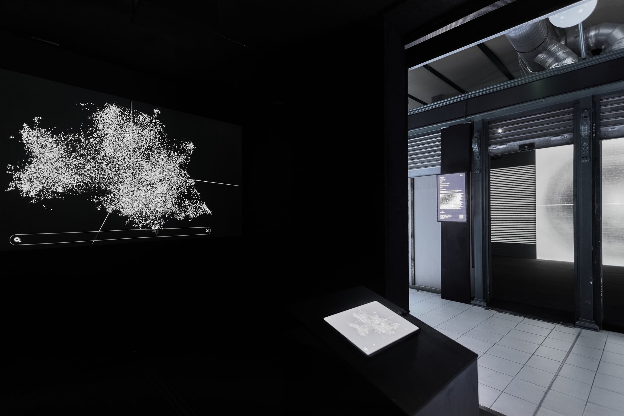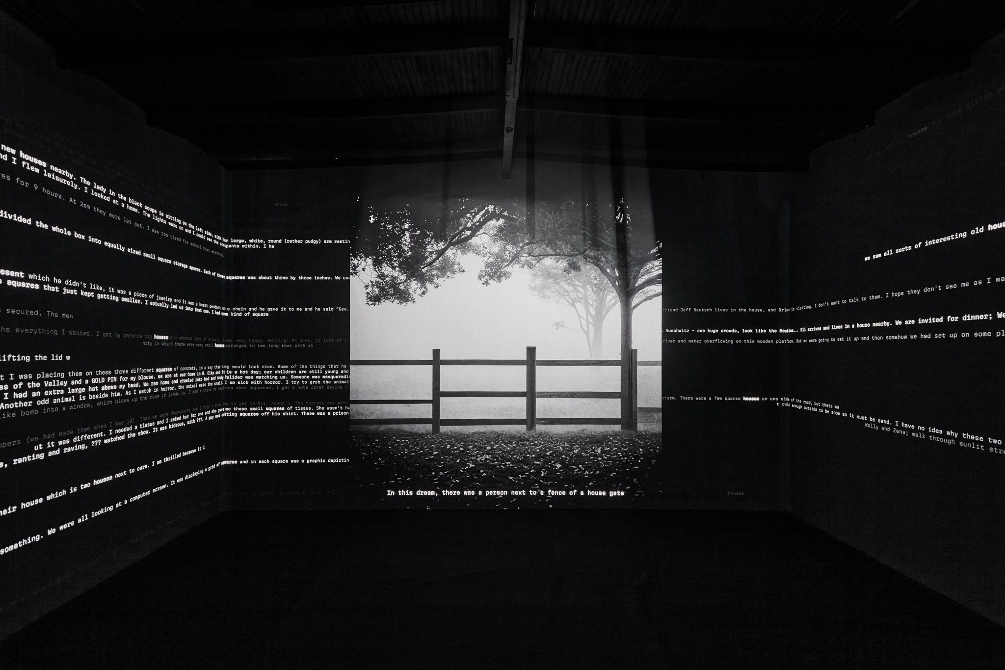 The installation was included in a black box, expanding across three walls: the central projection, carrying the main narrative, while the side walls displayed texts from the dream archives, surrounding the audience and deepening the experience.