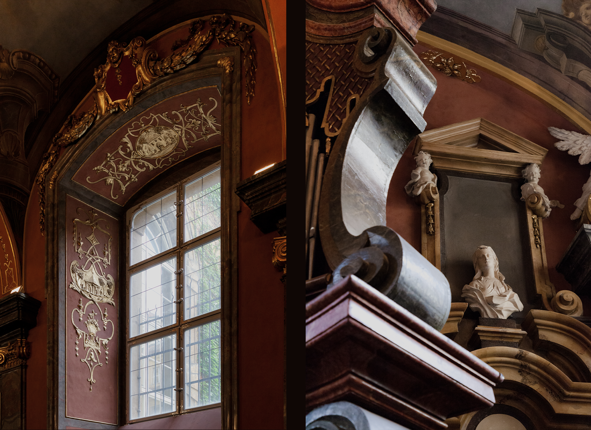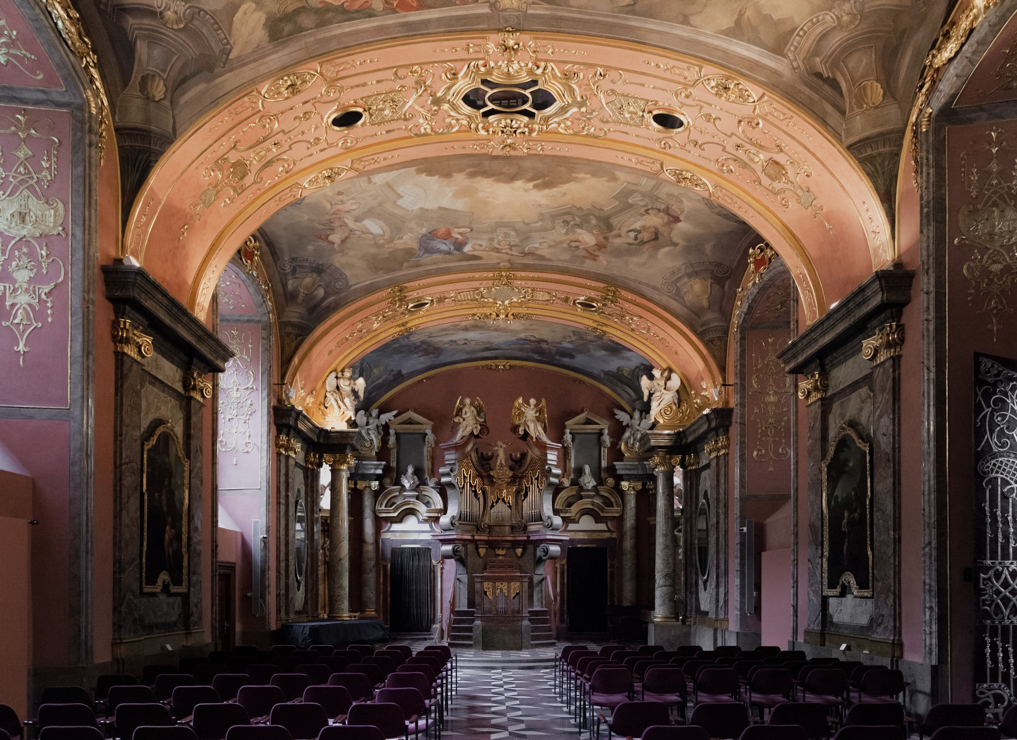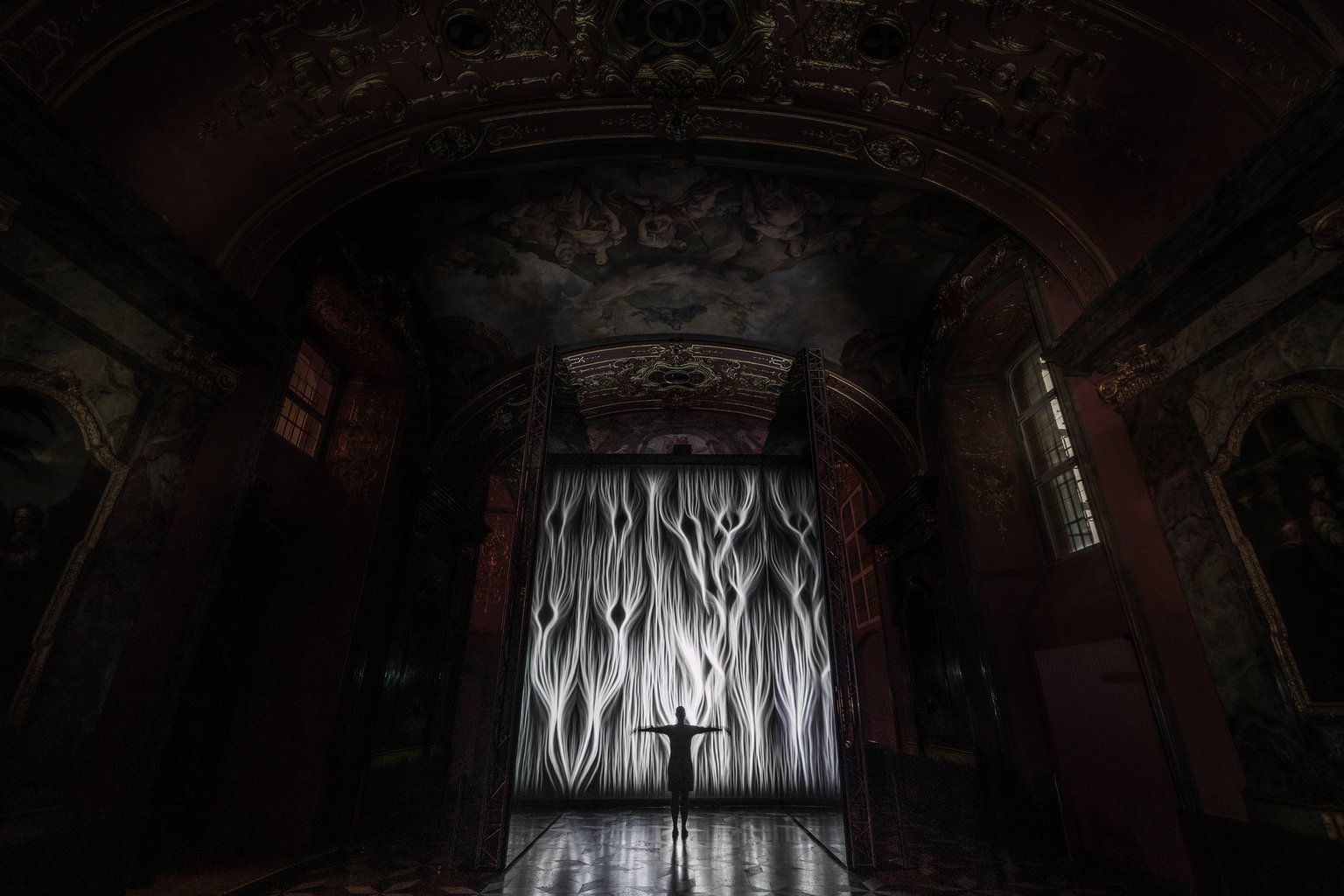 The installation was exhibited in the Klementinum Mirror Chapel, located in the heart of Prague's historic Klementinum complex. Built between 1724 and 1726, the Chapel stands as a testament to Baroque artistry and architectural innovation of the time. Designed by Giovanni Battista Alliprandi and completed in the early 18th century, the chapel features an opulent interior adorned with intricate stuccowork, gilded decorations, and a frescoed ceiling.