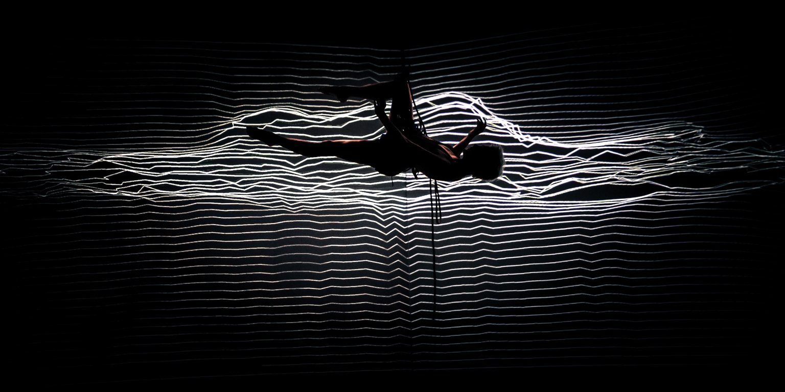Ljós (Icelandic for "light") represented the continuation of the studio’s exploration in digital and performative arts following the performance N of 2011. In Ljós, the performer serves as the gateway for the audience to enter a surreal, dreamlike realm—a shape-shifting dimension without gravity or time, where sounds and images react in real time. The visual metaphors in this piece are deeply intertwined with the theme of birth, depicting the journey of a life form gradually coming into contact with existence. Thus, the performer descends from above, ultimately reaching the ground by the end of the piece.